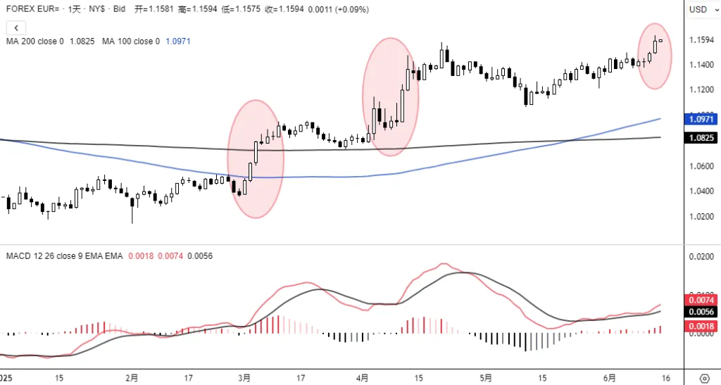 上周以来欧元一直展现出惊人的买盘,即便上周五非农超预期,终于以为可以洗一波市场头寸的时候,欧元跌了一天又涨回来了,自此一路开挂突破1.16,就问你前两天这两根阳线眼熟不?